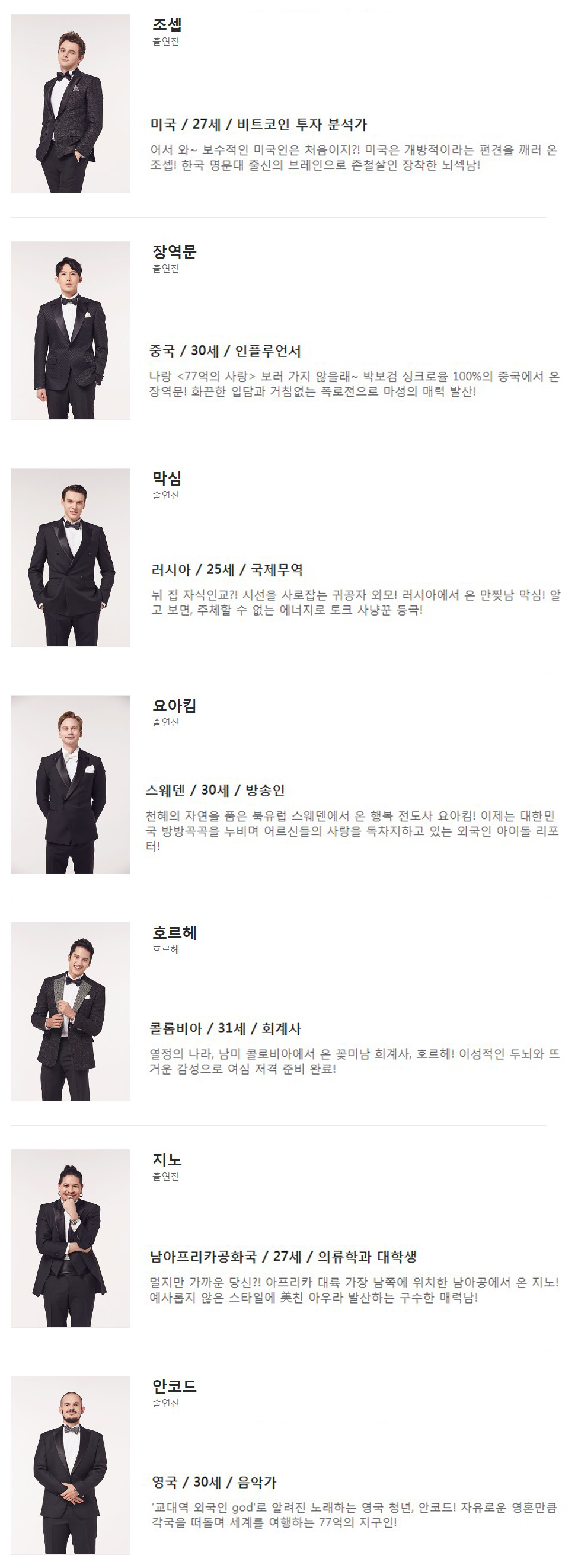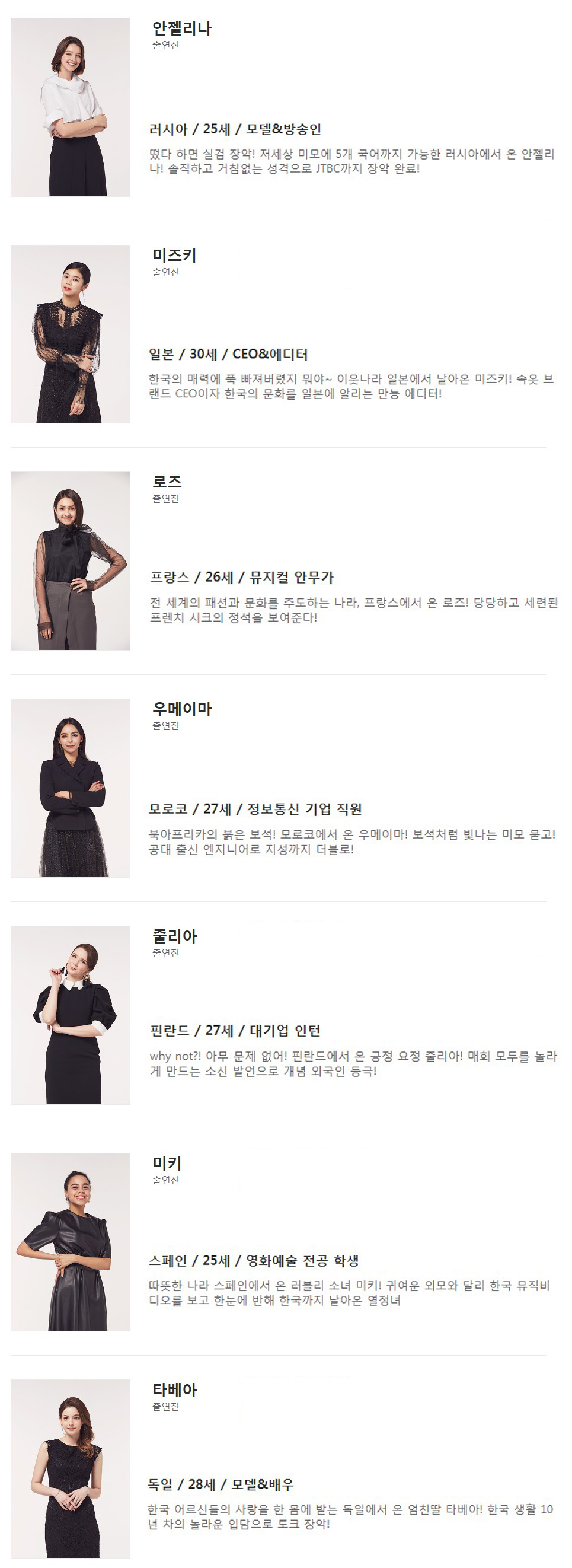 MC 3명과 외국에서 온 남성출연자 7명과, 여성출연자 7명이 함께 매주 새로운 주제와, 시청자들의 사연을 토대로 다양한 의견을 나누는데요. 여기서 출연하는 분들을 소개합니다.