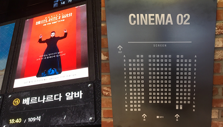 용산 CGV 2관에서 상영했는데요. 2관은 화면이 커서 그런지 앞쪽은 너무 올려다보게 될 것 같더라구요. 나름의 후기로 중앙열에서 뒤쪽이 좋다고 추천이 많아서 고민끝에 H열 중앙으로 좌석을 택했습니다.