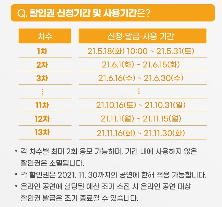 적용장르 : 뮤지컬, 연극, 클래식, 오페라, 무용, 국악, 복합 등(대중가수 콘서트 및 전시 등 제외)