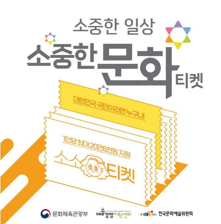 '소중한 일상 소중한 문화티켓'의 준말로 공연예술 관람료 지원 사업은 코로나로 인해 침체된 공연예술계를 지원하기 위해 운영되는 사업으로 소중한 문화를 다양하게 즐길 수 있도록 공연 예매 시 할인권을 제공하는 사업입니다.