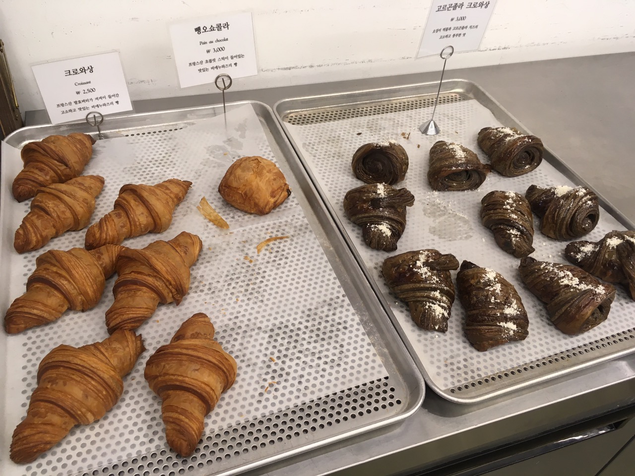 내부는 굉장히 심플하게 벽들 둘러 다양한 빵들이 진열되어 있었습니다. 맛스러워보이는 쿠키들 옆에는 먹음직스러워 보이는 크로와상과 뺑오쇼콜라가 놓여있네요.