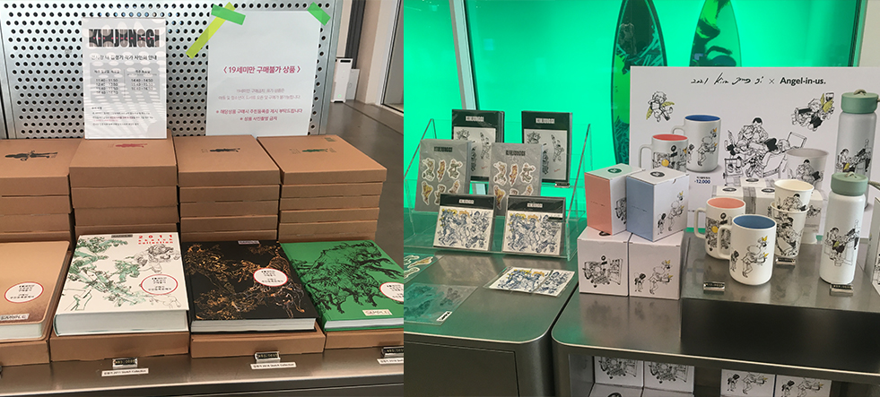 초기작과 라이브드로잉 섹션 다음으로 여행과 기업 협업 작업 섹션, 그리고 마지막으로 굿즈관으로 이어졌습니다.