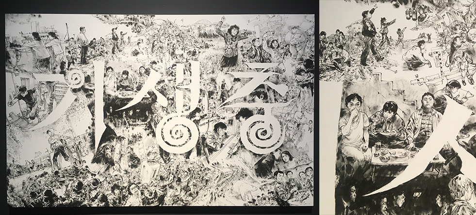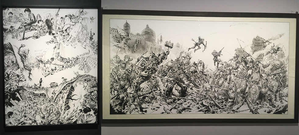 김정기 작가는 시네마틱 영상만 보고, 게임 속 배경과 댈비 구도를 섬세하고 웅장하게 담아내었습니다. 밑그림 없이 오직 기억과 붓으로 흑백의 명암을 살려 긴장감 있는 대립상황을 정말 현장감 넘치게 그려 감탄을 자아냈죠.