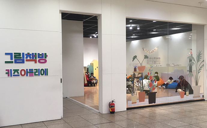 전시장 바깥에는 '그림책방 키즈 아틀리에'라고 전시에 소개된 그림책들을 읽어볼 수 있는 휴게 공간이 있었구요. 이미 사람들이 많은 관계로 들어가진 않았어요.(전시 두탕 뛰느라 힘들기도 했고...)
