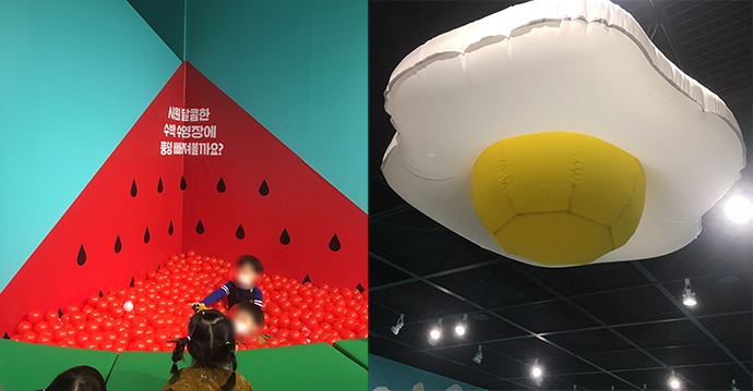한쪽에는 아이들이 들어갈 수 있는 수박 풀장도 있었고, 하늘에는 거대한 후라이가 떠있네요.