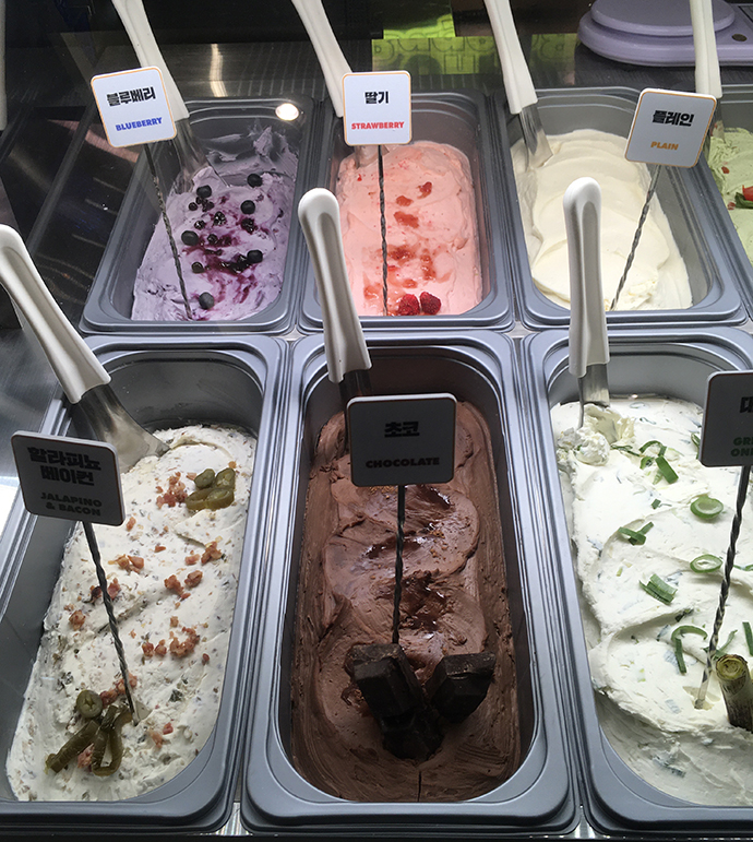 크림치즈의 종류가 정말 많고 특이한 맛도 많다 보니 정말 고민되더라구요. 서서 대략 5분 동안 진지하게 갈등 때렸네요. 개인적으로는 오른쪽의 익숙한 맛의 크림치즈와 달리 왼쪽에는 독특한 재료로 만든 크림치즈들이 많았는데요. 그래서 호기심이 동하더라구요.