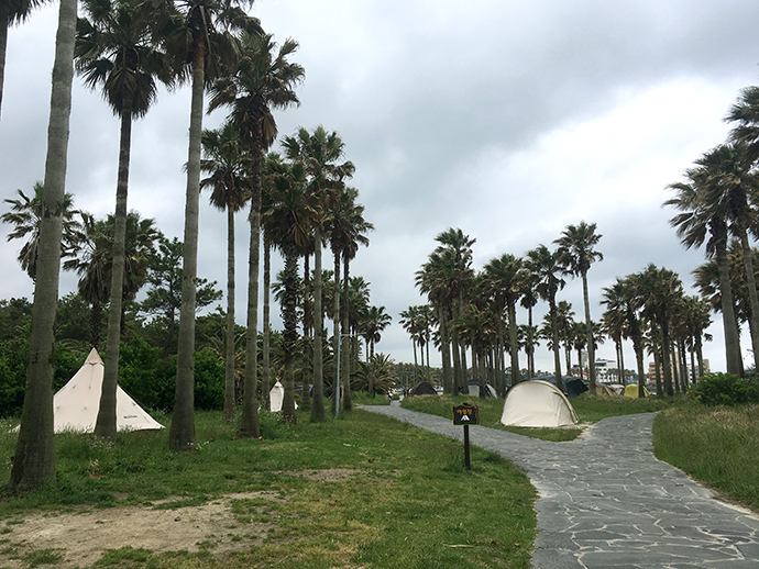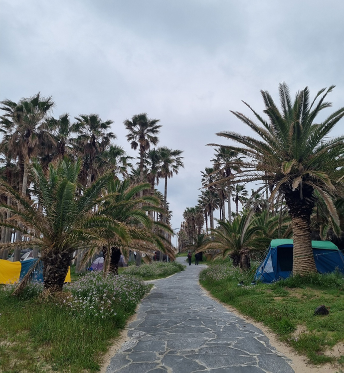 걷다보니 쫙 펼쳐진 야자수 길이 장관이였는데요. 알고보니 캠핑 성지였던 듯 텐트가 진짜 많더라구요.