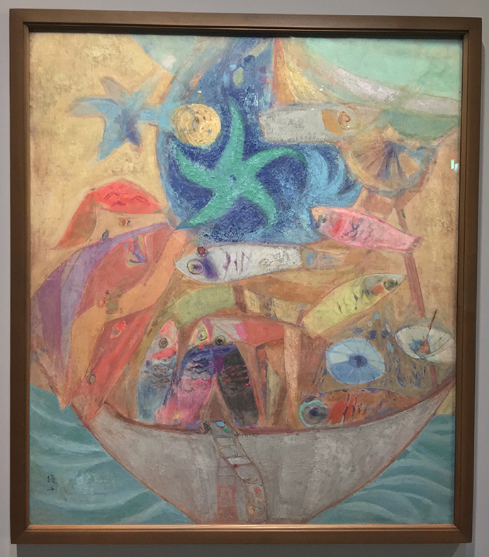 천경자 화가는 선채를 자유자재로 구사하여 환상적인 색채와 배에 가득 실린 물고기를 통해 자연이 인간에게 주는 풍요로움을 표현하였습니다.