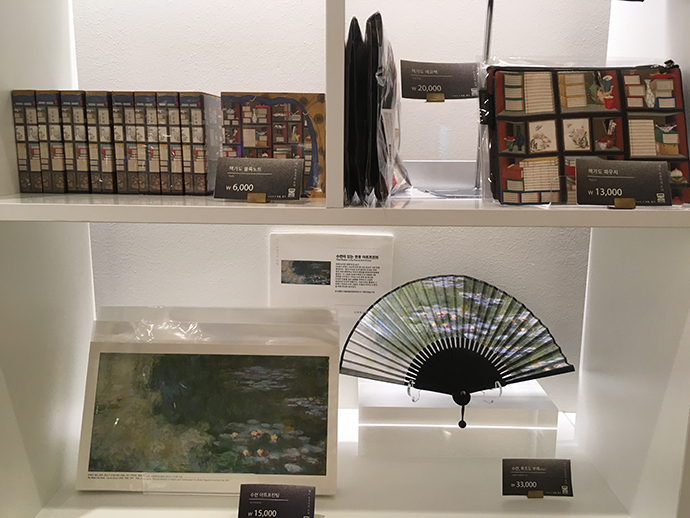 전시장 그림과 관련하여 다양한 전통 굿즈가 돋보였는데요. 책가도를 배경으로 만들어진 파우치나 스카프가 눈에 띄더라구요. 수련 엽서도 참 이뻤습니다. 근데 가격이...😨