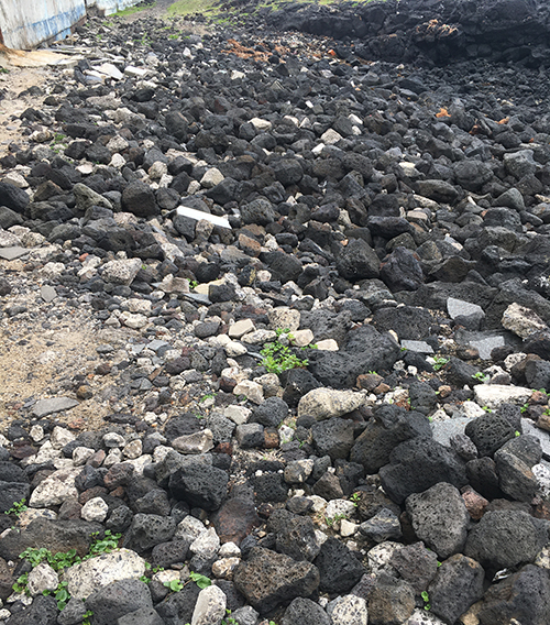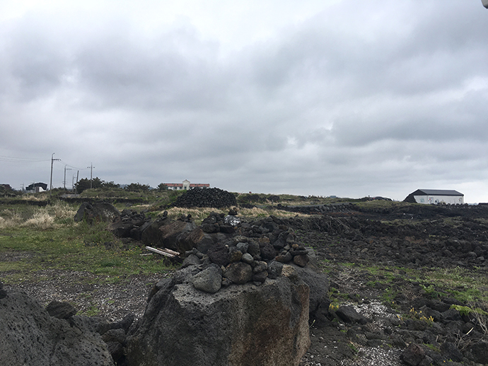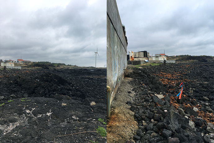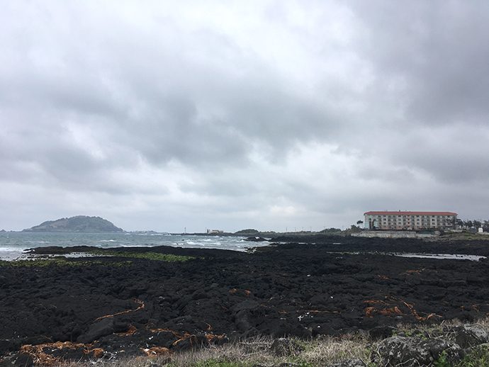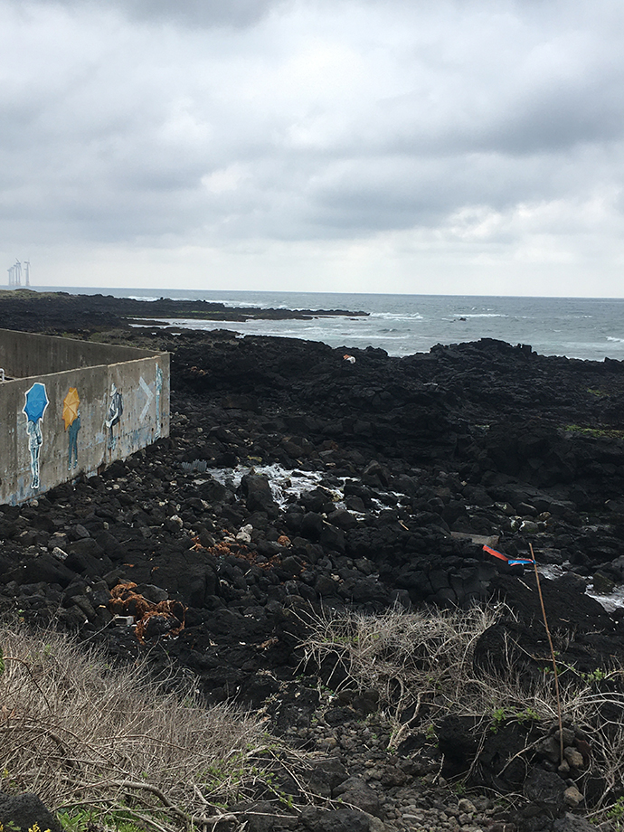 뒤를 돌아보니 저 멀리 아까 바다에서 봤던 비양도도 보이고, 그 옆 일성제주 비치콘도와 건너왔던 스사한 벽과 돌길이 보이네요.(여기까지 걸어오다니...😳)