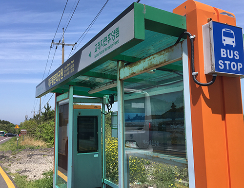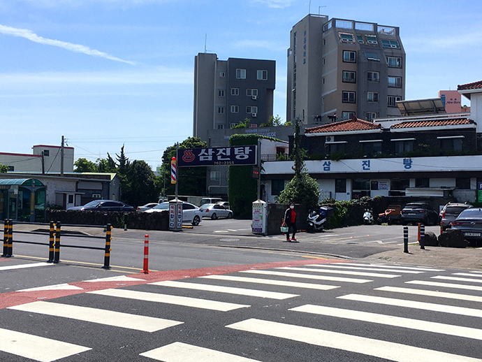 숙소 근처에서 버스를 타고 구서귀포 지역의 삼진탕이라는 옛날 목욕탕이 보이는 버스정류장에 내렸어요. 이곳에서 231번 버스를 타면 한 번에 갈 수 있습니다.