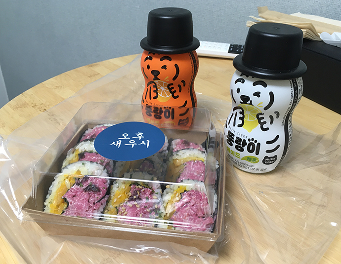 편의점에서 뚱랑이 음료 사가지고 와서 드디어 숙소서 먹어보는 김밥. 늦점심을 먹어서 그런지 여전히 배는 불렀지만, 그래도 얌얌 맛있게 들어가더라구요.(역시 내 위장👍)