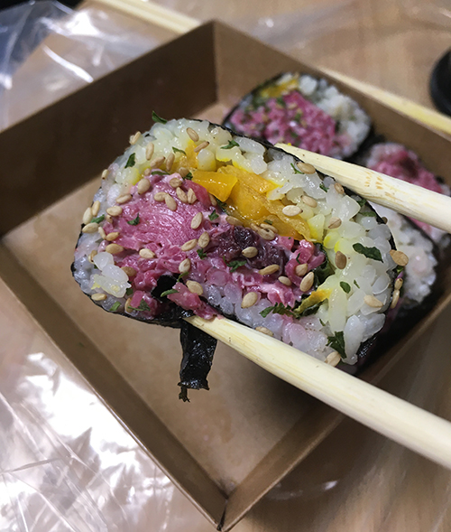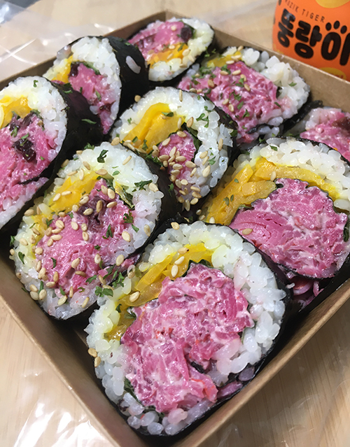 드디어 주문한 음식이 나왔습니다. 저는 허니마요 게살김밥을 골랐는데요. 이렇게 이쁜 김밥 첨 보네요. 기대감을 안고 버스에 올라봅니다.