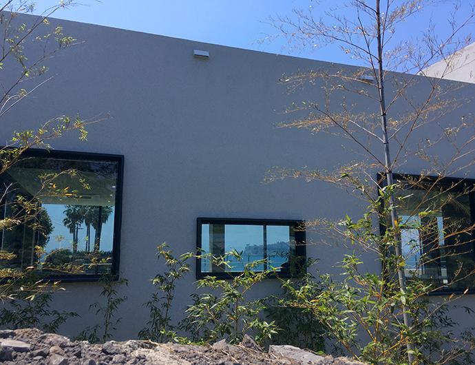 속골에서 넘어오니 슬슬 주택가로 접어들었는데요. 바다 옆에 다양한 창이 새겨진 굉장히 시원해보이는 카페가 있었어요.