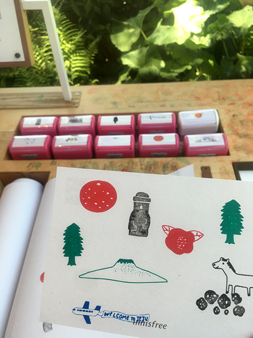 제주를 기념하는 모양의 도장을 찍어볼 수 있는 체험이 있어서, 무료로 제공되는 엽서에 열심히 찍어봤습니다. 은근 재밌더라구요.😆