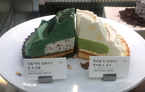 특히 돋보였던 메뉴는 바로 흑임자 칠성돌 케이크.진짜 현무암 돌멩이처럼 생겨서 너무 신기했어요. 한라산 케이크(10,000원)을 제외하면 다른 케이크는 7,000원대고, 아이스크림은 4~5천원대, 그리고 음료는 6~7천원대였어요.