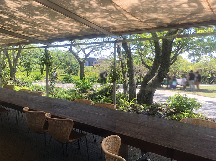 가장 안쪽에 이렇게 통 나무 테이블로 널찍하게 먹을 수 있는 공간이 있습니다. 녹차밭을 바라보며 쉬어가는 것도 좋겠더라구요.