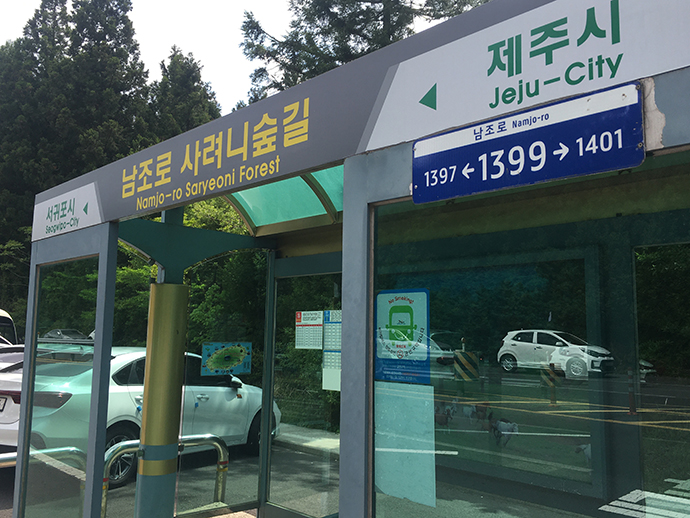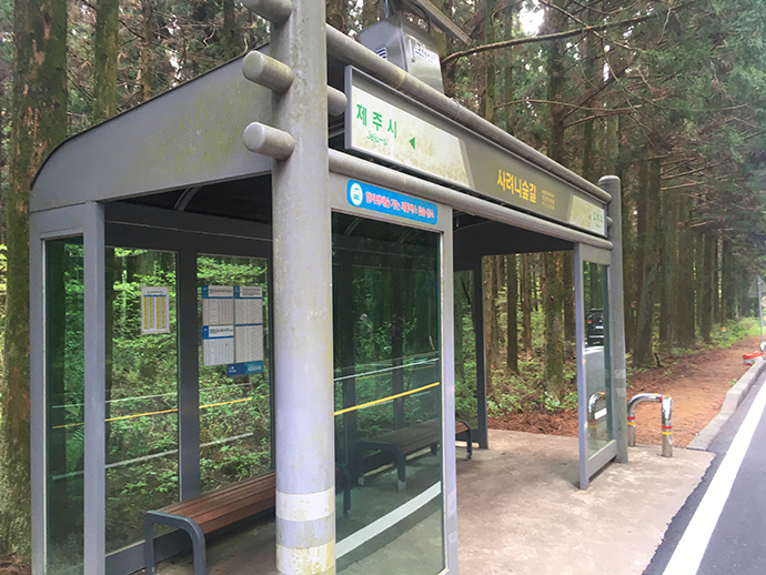 구서귀포 숙소에서 232번 버스를 타고 1시간 조금 넘는 시간이 되어 도착한 사려니숲길 버스정류장.