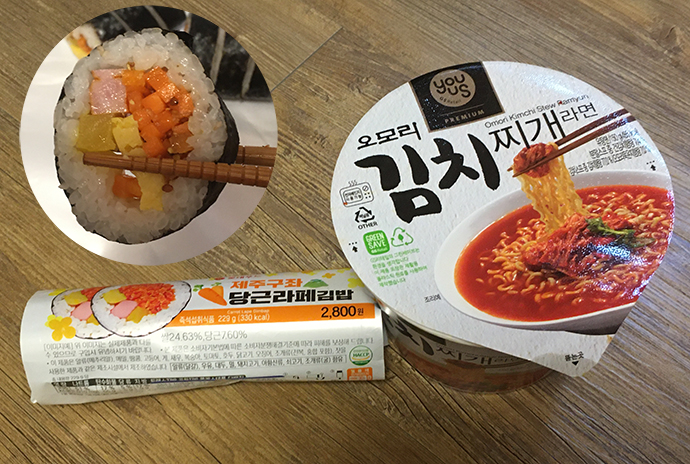 하루종일 너무 걸었더니 지쳐서 오늘도 숙소에서 저녁을 먹어봅니다. 너무 좋아하는 오모리 김치찌개라면과 제주구좌 당근라페김밥이라는 것을 구매했는데요.(역시 피곤할 때 얼큰한 거~😆)