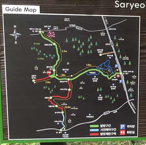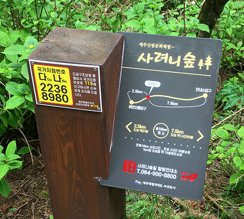 이곳 앞에는 주차를 할 수 없고, 사려니숲길 이름이 쓰여진 나무둥치에 쓰여있는 방향으로 조금 더 가야 따로 주차공간이 나온다고 하더라구요.