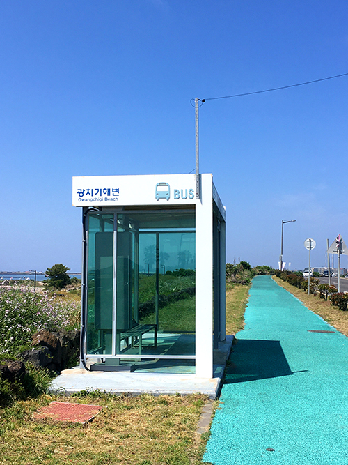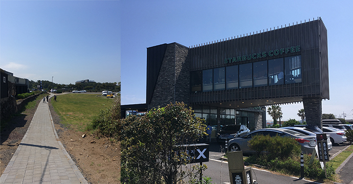 이제 버스정류장을 타기 위해 도로쪽으로 걸어나갑니다. 사실 광치기해변까지 온 이유 중 하나는 바로 스타벅스 제주성산DT점에서 쉬면서 경치를 구경하기 위함이였는데요.