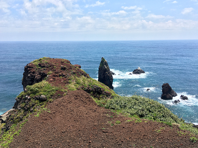 위에 올라가면 조선시대에 봉화를 올렸던 연대가 있는데, 다른 해안과는 달리 붉은 화산재 송이로 덮여 있고 해안가의 많은 기암괴석들이 마치 수석 전시회를 여는 듯한 독특한 모양새를 하고 있습니다.