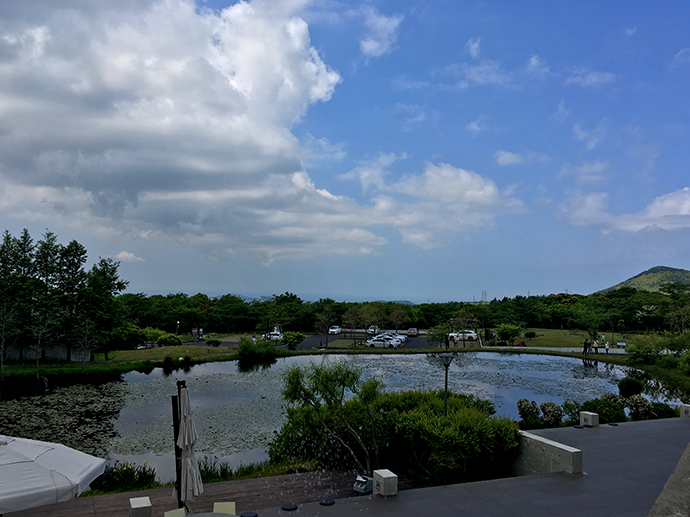 옥상에서 내려다보는 연못이 참 예뻤어요. 바로 아래 카페도 있고, 저 멀리 오름도 보이네요.