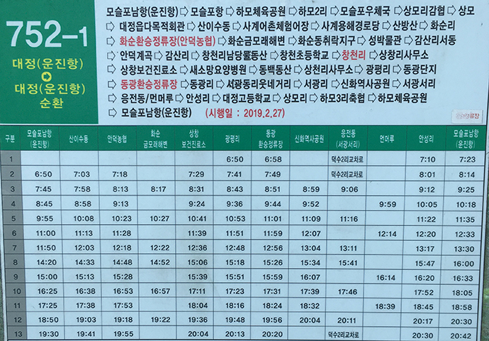 조금 기다리다 보니 752-1번이 와서 바로 탔습니다. 이 버스만 타면 사실 환승하는 곳인 창천리에서는 버스 걱정이 없었기 때문에 확 긴장이 풀리고 그때서야 피로가 급 몰려왔습니다.